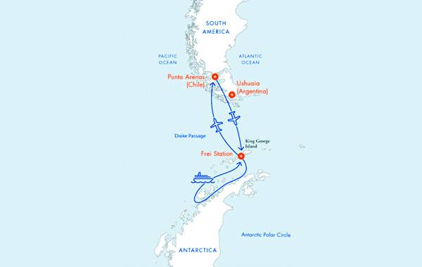 Scheduled flight to Antarctica Your Antarctic adventure begins with a two-hour flight from Punta Arenas to King George Island, in the South Shetland Islands. As you exit the airplane, the clear Antarctic air fills your lungs for the first time. The 2-km (1.25-mi) walk to the shore, where you board a Zodiac to embark your expedition vessel, takes you through Chile's Frei Station and Russia's Bellingshausen Station.