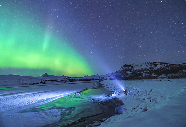 snowy winter, Polar night (when the sun shows up only a couple of hours a day) and hunt for the real wonder of the northern areas - twinkling Northern lights.